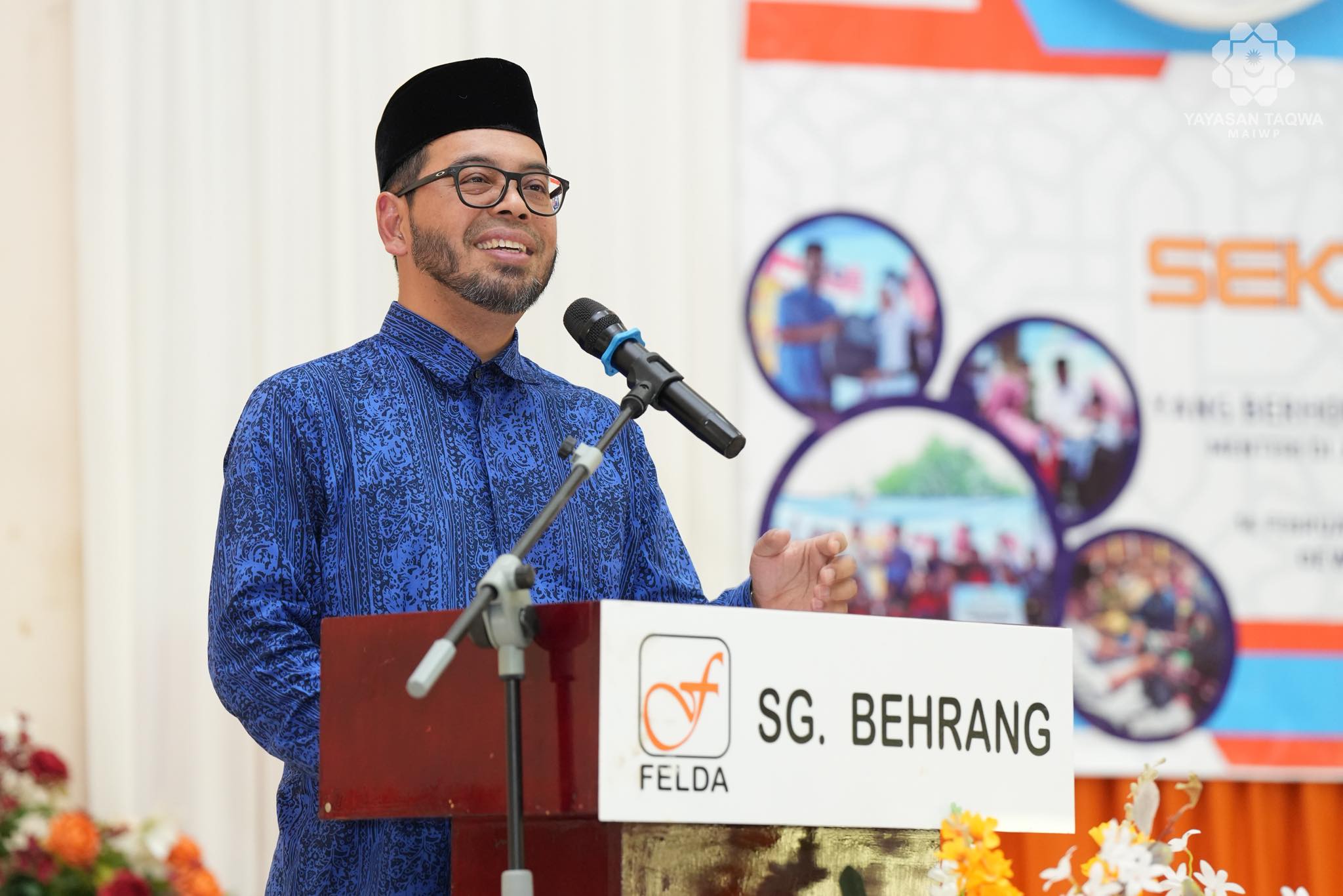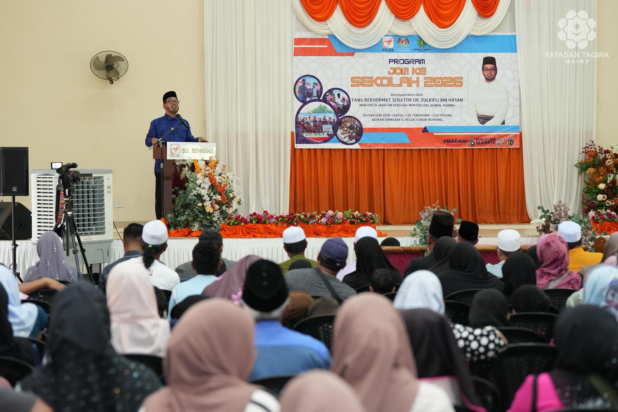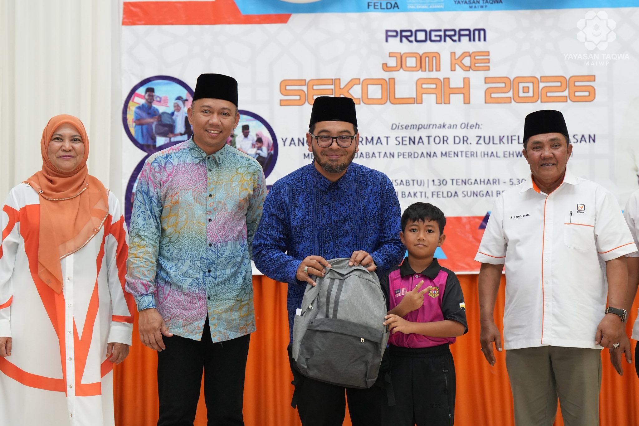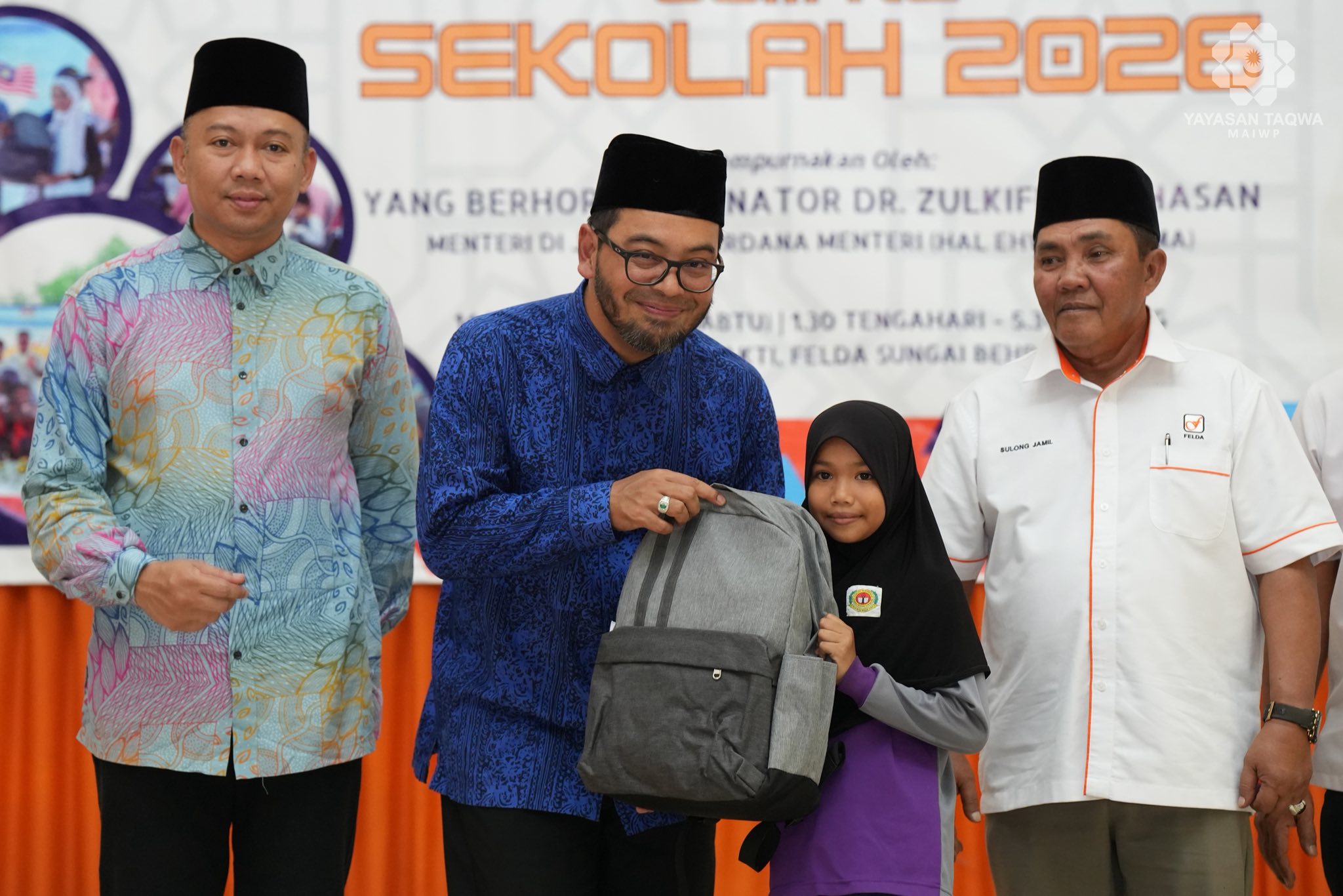 Majlis penyampaian sumbangan telah disempurnakan oleh YB Senator Dr. Zulkifli bin Hasan, Menteri di Jabatan Perdana Menteri (Hal Ehwal Agama). Turut hadir ialah YB Hajah Salina binti Samsudin, Ahli Dewan Undangan Negeri (ADUN) Behrang, Y.Bhg. Tuan Hj. Abdullah Zuhdee bin Ab Halim, Ketua Pegawai Eksekutif Yayasan Taqwa-MAIWP, Y.Bhg. Tuan Shahariman bin Dollah Hashim, Pengarah FELDA Wilayah Trolak, Y.Bhg. Datuk Hj. Sulong Jamil Mohamed Shariff, Ketua Peneroka FELDA Sungai Behrang merangkap Ketua Peneroka FELDA Kebangsaan serta Y.Bhg. Tuan Zambri bin Kasim, Pengurus Rancangan FELDA Sungai Behrang bersama tetamu jemputan, ibu bapa dan para pelajar.