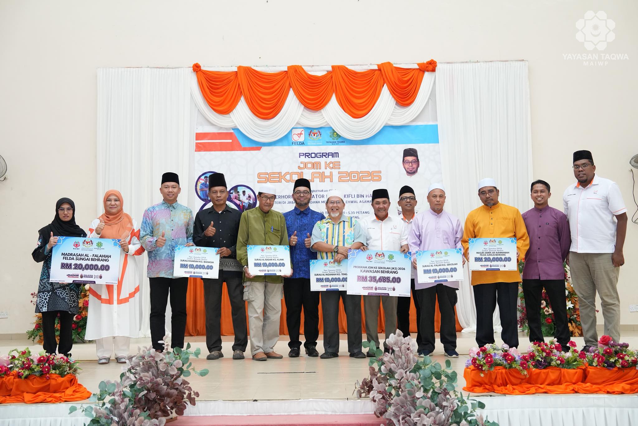 14 FEBRUARI 2026, BEHRANG – Yayasan Taqwa-MAIWP telah menyampaikan sumbangan berjumlah RM35,685 menerusi Program Jom Ke Sekolah (JKS) di kawasan Behrang dengan kerjasama FELDA Sungai Behrang.