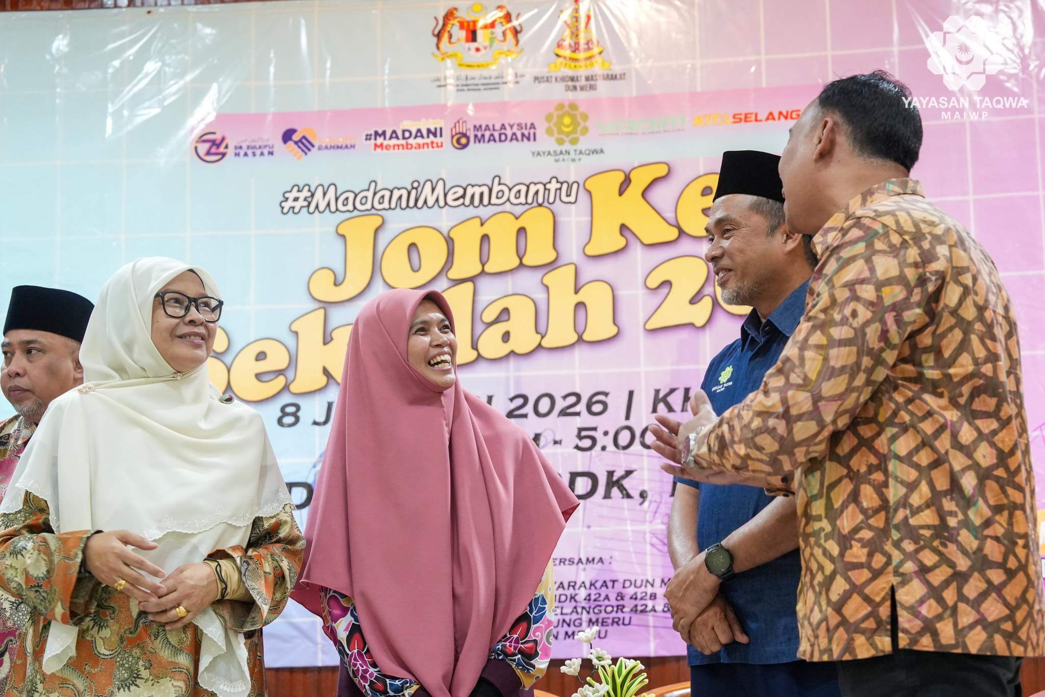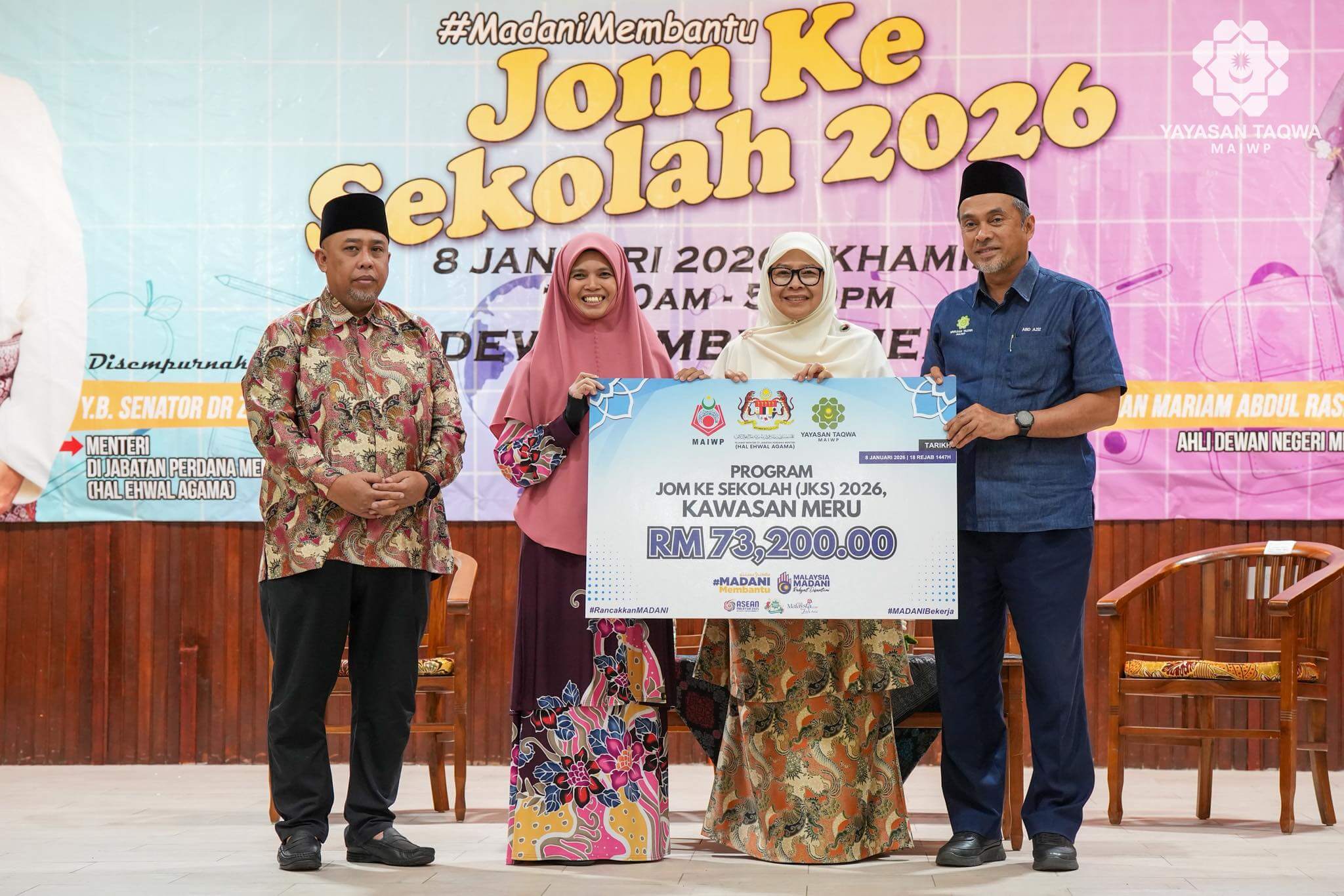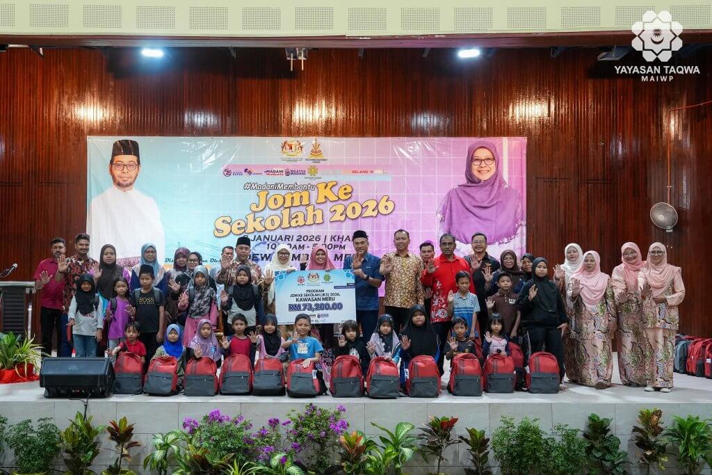8 Januari 2026, MERU, KLANG – Yayasan Taqwa-MAIWP telah menyampai sumbangan berjumlah RM73,200 melalui Majlis Penyampaian Sumbangan Program Jom Ke Sekolah (JKS) 2026 dengan kerjasama Pusat Khidmat Masyarakat Dun Meru. Melalui majlis ini, seramai 400 orang pelajar sekolah rendah & menengah dari kawasan sekitar Meru Klang telah menerima sumbangan berupa set pakaian & keperluan persekolahan.