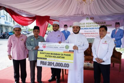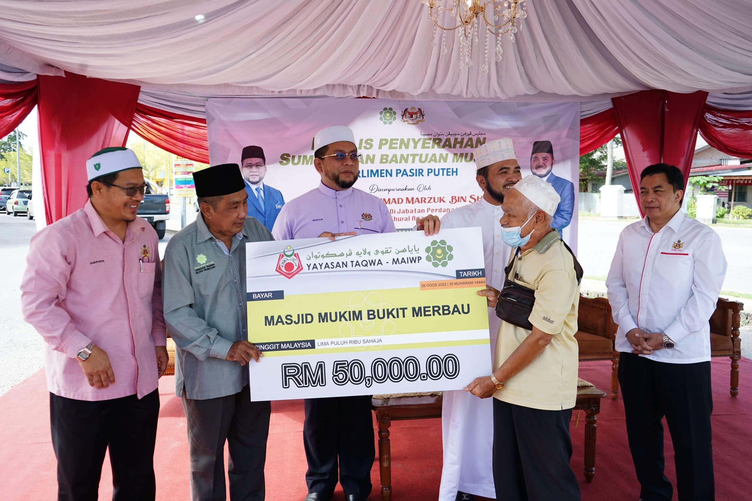 28 Ogos 2022, Kelantan – Pada hari ini Majlis Agama Islam Wilayah Persekutuan (MAIWP) melalui Yayasan Taqwa telah mengadakan Majlis Penyerahan Replika Cek Sumbangan Bantuan Musibah Ribut dan Bantuan Baikpulih Masjid di Pengkalan Chepa, Pasir Puteh dan Bachok,Kelantan.