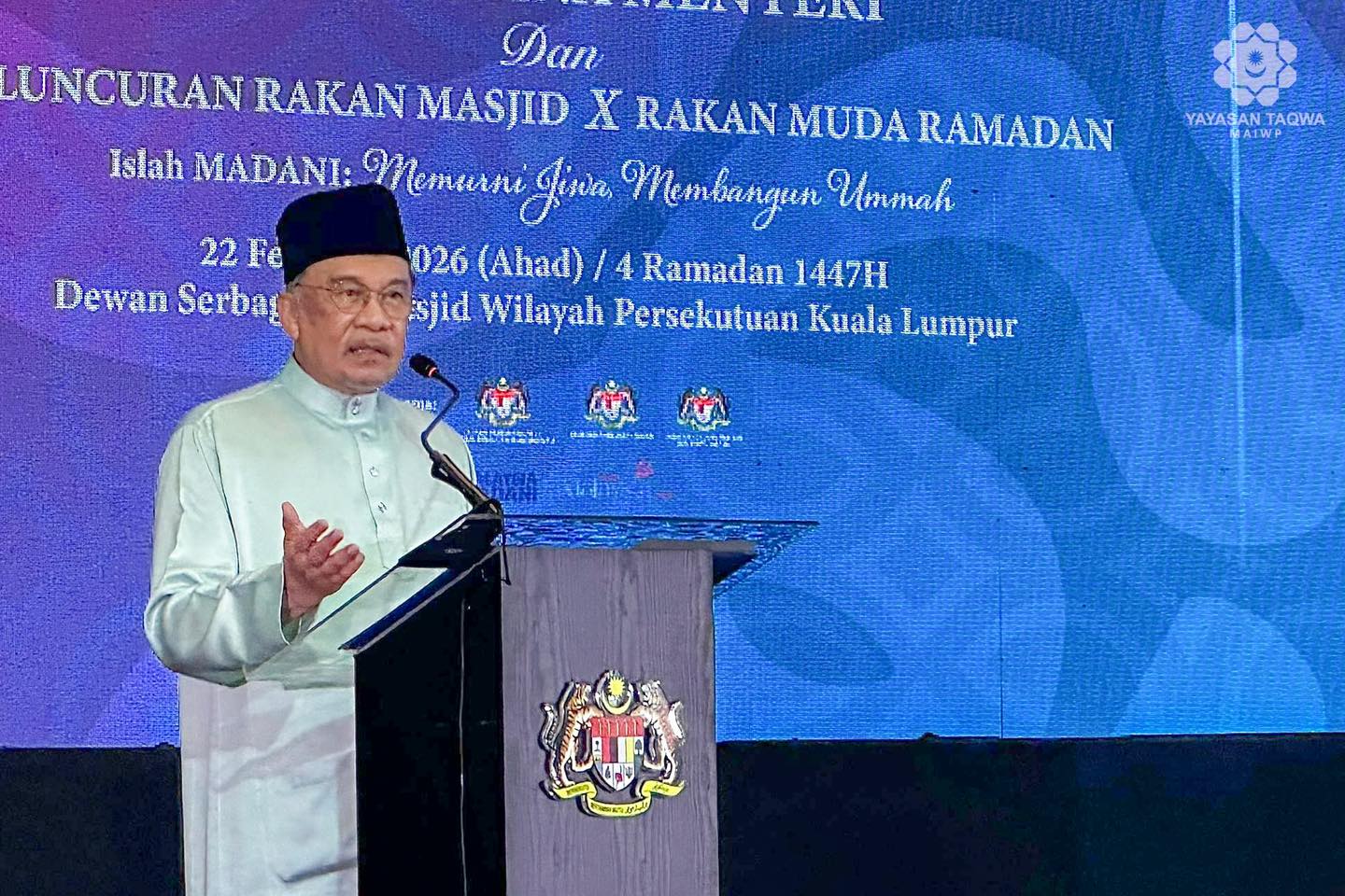 KUALA LUMPUR, 22 Februari 2026 – YAB Perdana Menteri, Datuk Seri Anwar Ibrahim pada harini melancarkan Rakan Masjid x Rakan Muda Ramadan iaitu sebuah inisiatif untuk menghubungkan institusi Masjid dengan anak-anak muda. Beliau menyatakan inisiatif tersebut adalah selari dengan inspirasi Malaysia Madani yang menekankan pembangunan insan secara menyeluruh .