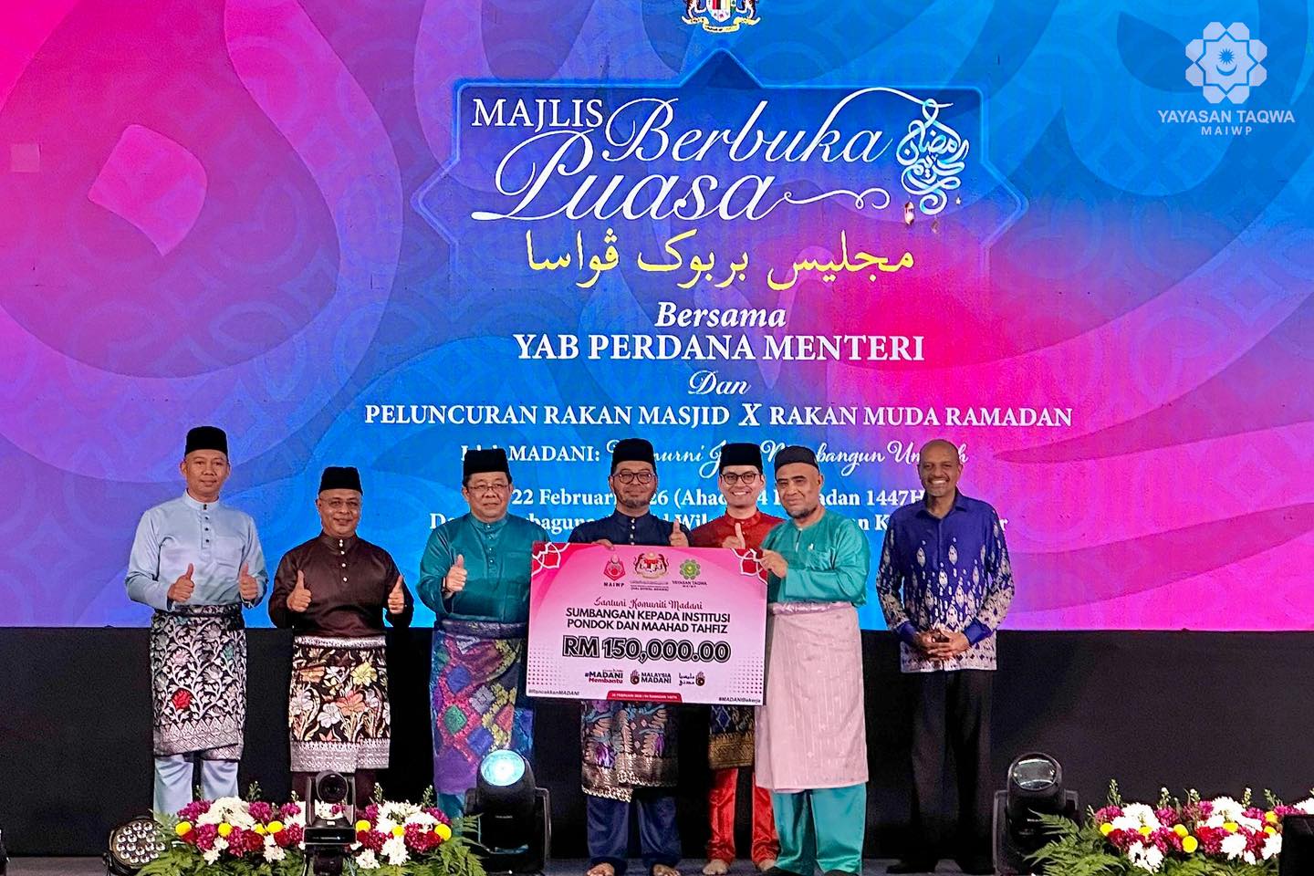 Di dalam majlis yang sama, Majlis Agama Islam Wilayah Persekutuan (MAIWP) telah menyampaikan sumbangan Ramadan kepada golongan asnaf berjumlah RM365,611,000 yang memanfaatkan 38,490 penerima di Wilayah Persekutuan manakala Yayasan Taqwa-MAIWP juga turut menyampaikan sumbangan berjumlah RM150,000. Sebanyak 15 buah Institusi Pendidikan Islam negeri-negeri akan menerima sumbangan berjumlah RM10,000 bagi setiap Institusi Pendidikan Islam yang terpilih yang disampaikan oleh YB. Senator Dr. Zulkifli bin Hasan, Menteri di Jabatan Perdana Menteri (Hal Ehwal Agama) dan disaksikan oleh YB. Dr. Mohammed Taufiq bin Johari, Menteri Belia dan Sukan.