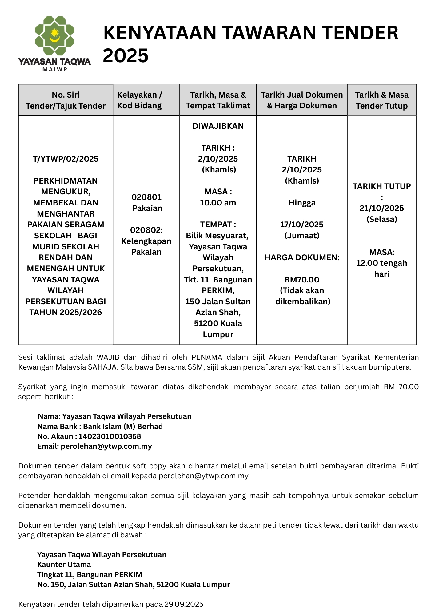 Tawaran Tender Perkhidmatan Mengukur, Membekal Dan Menghantar Pakaian Seragam Sekolah Bagi Murid Sekolah Rendah Dan Menengah Untuk Yayasan Taqwa Wilayah Persekutuan Bagi Tahun 2025/2026